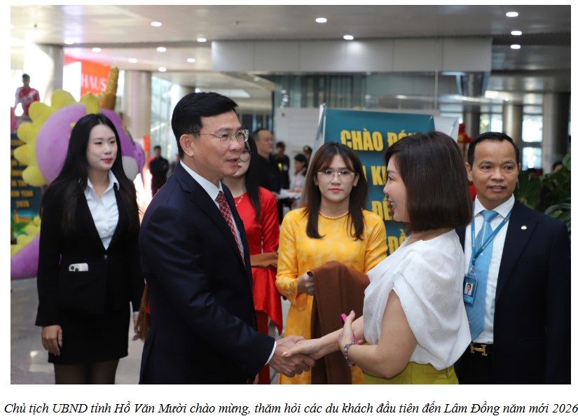 Chủ tịch UBND tỉnh Hồ Văn Mười cùng Phó Chủ tịch UBND tỉnh Đinh Văn Tuấn chào đón, tặng quà cho các du khách đầu tiên đến tỉnh Lâm Đồng năm mới 2026