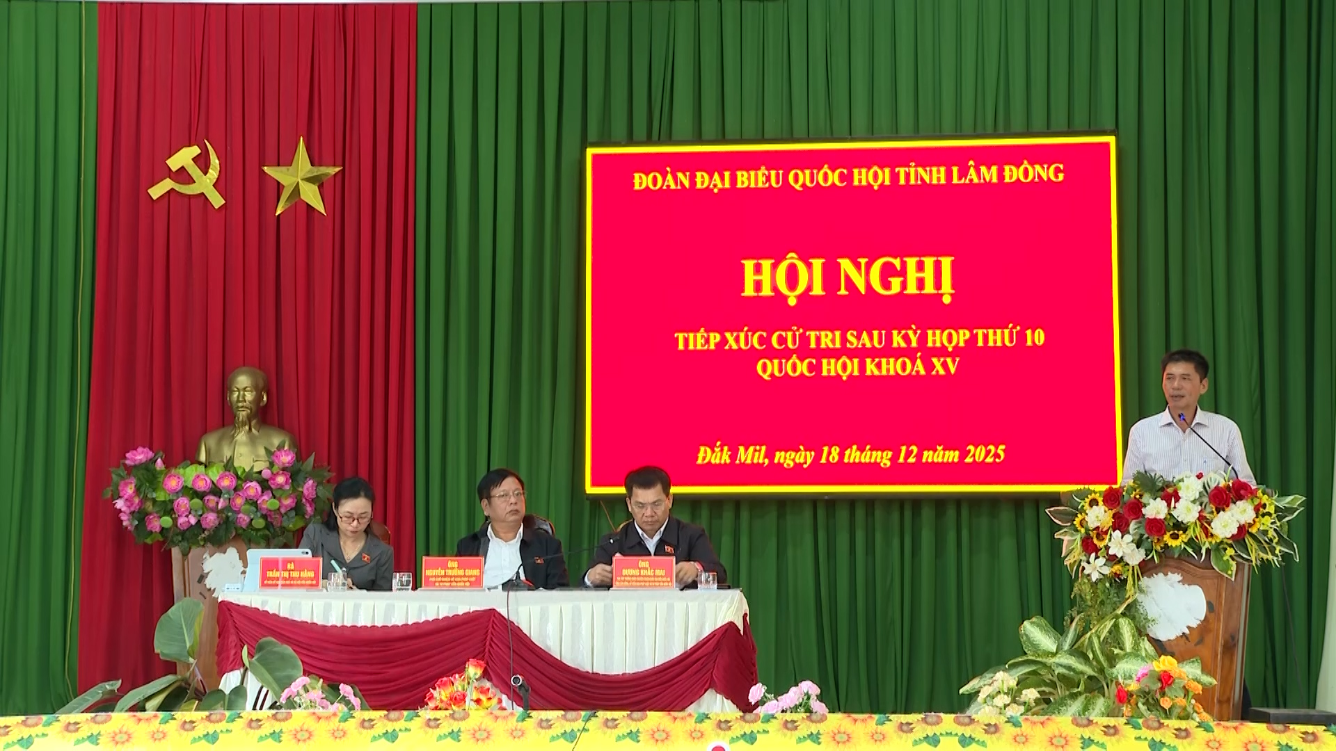 Tham dự hội nghị có đoàn đại biểu Quốc hội tỉnh Lâm Đồng bao gồm: Ông Nguyễn Trường Giang – Phó chủ nhiệm Uỷ ban Pháp Luật và Tư Pháp của Quốc Hội, Ông Dương Khắc Mai – TUV Phó trưởng Đoàn Chuyên trách Đoàn đại biểu Quốc hội tỉnh Lâm Đồng, Bà Trần Thị Thu Hằng – Uỷ Viên Uỷ ban Văn Hoá và Xã Hội của Quốc hội. Về phía địa phương có Ông Trương Văn Bình, Bí thư Đảng uỷ - Chủ tịch HĐND xã, Ông Nguyễn Quốc Dũng, Phó Bí thư – Chủ tịch UBND xã cùng đại diện Lãnh đạo các sở, ban, ngành của tỉnh, xã Đắk Mil và đông đảo cử tri trên địa bàn xã.