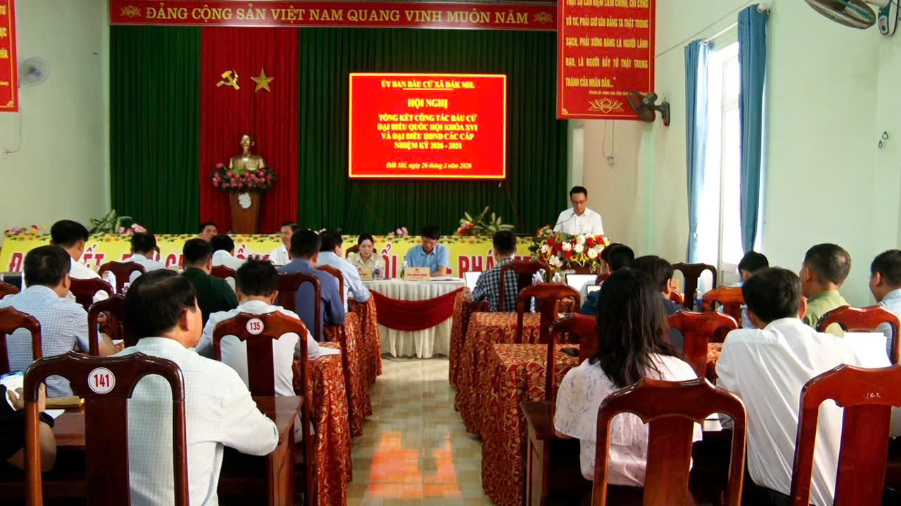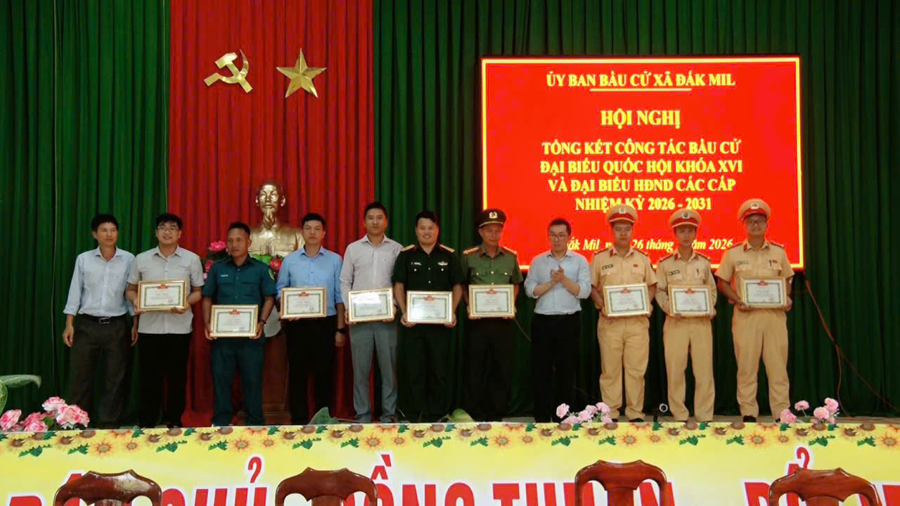 Dịp này, Ủy ban bầu cử xã Đắk Mil đã khen thưởng 12 tập thể và 37 cá nhân có thành tích xuất sắc trong công tác bầu cử đại biểu Quốc hội khóa XVI và đại biểu HĐND các cấp nhiệm kỳ 2026–2031.